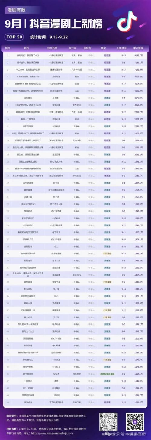 此榜单TOP50,根据抖音端原生9.1-9.29上线发布的漫剧播放量数据统计得出。