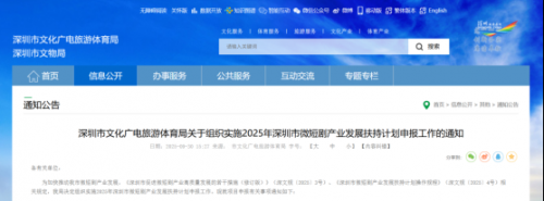 为加快推动深圳市微短剧产业发展,根据深圳市政府发布的《深圳市促进微短剧产业高质量发展的若干措施(修订版)》(深文规〔2025〕3号)、《深圳市微短剧产业发展扶持计划操作规程》(深文规〔2025〕4号)相等文件规定,深圳市文化广电旅游体育局现已启动2025年深圳市微短剧产业发展扶持计划申报工作。各企业可根据官网通知(http://wtl.sz.gov.cn/xxgk/qt/tzgg/content/post_12421793.html)要求,于10月17日前完成项目申报。