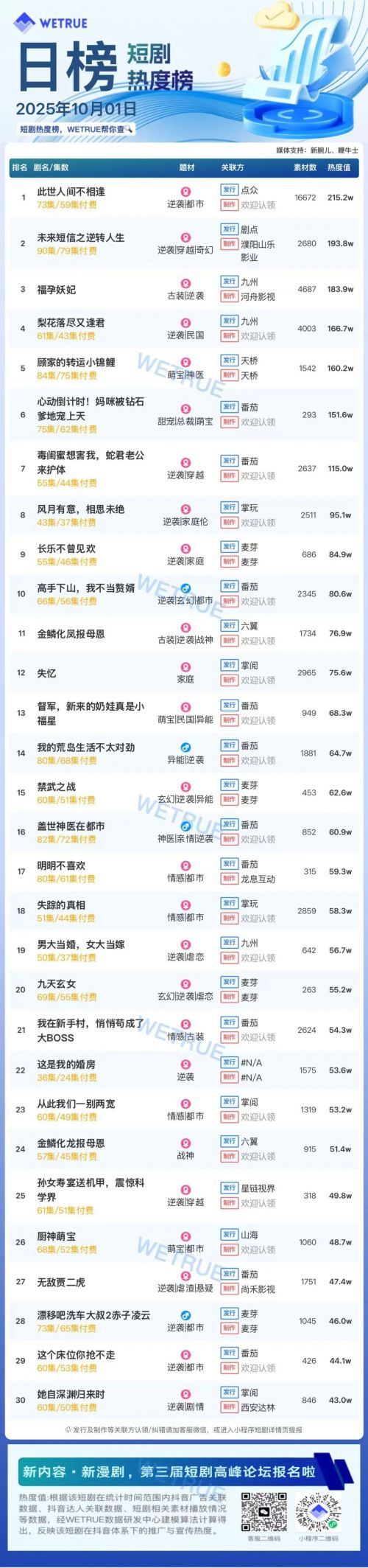10月1日付费短剧大盘4512万:《此世人间不相逢》第一 2025-10-03 20:22 新腕儿 今天发布的是昨天(10月1日)短剧付费大盘日榜,整体大盘热度值为4512万。 分享到 精彩推荐 金塔:戈壁滩铺就“绿电蓝海” 金昌市首批“营商环境体验官”聘任上 敦煌葡萄今年首次自主出口海外 临夏花椒实现销售收入1.2亿元 甘肃抗日战争革命文献展在兰州展出 银河到底有多宽?(把自然讲给你听) 今年华北雨季为何偏长 敦煌第九届葡萄文化旅游节即将举办 天津采访团定格皋兰新图景 多部爱情片扎堆上映 今年七夕大银幕 兰州多领域攻坚书 文明新风拂七里 万人开跑 半程马 兰州市积极应对强 甘肃省发布地质灾 “马背法庭”并未