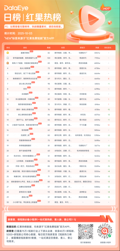 本期TOP30的微短剧热度均超5300W。值得关注的是,本期共有3部新剧空降榜单。王小亿和蓝博主演的都市情感题材新剧《惊鸿掠野》空降红果榜第16,热度达5856W。